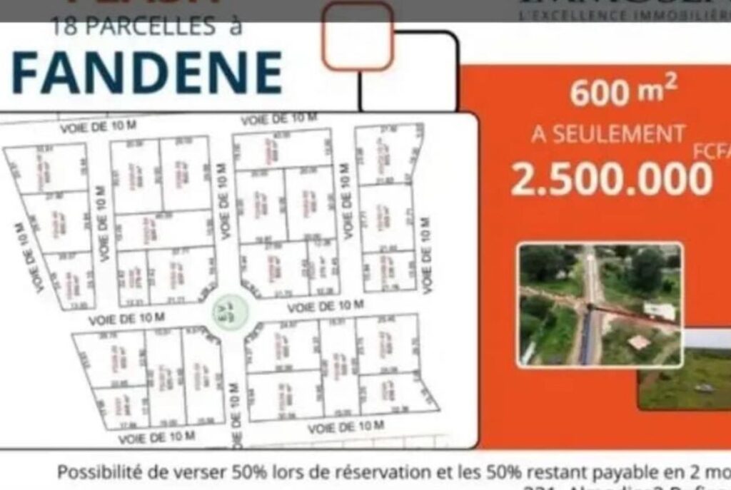 Découvrez nos 18 parcelles exclusives situées à Fandene, dans la région de Thiès. Idéales pour votre projet résidentiel, ces parcelles de 600 m² sont proposées dans un lotissement planifié avec des voies d’accès de 10 mètres, garantissant un cadre de vie agréable et organisé.